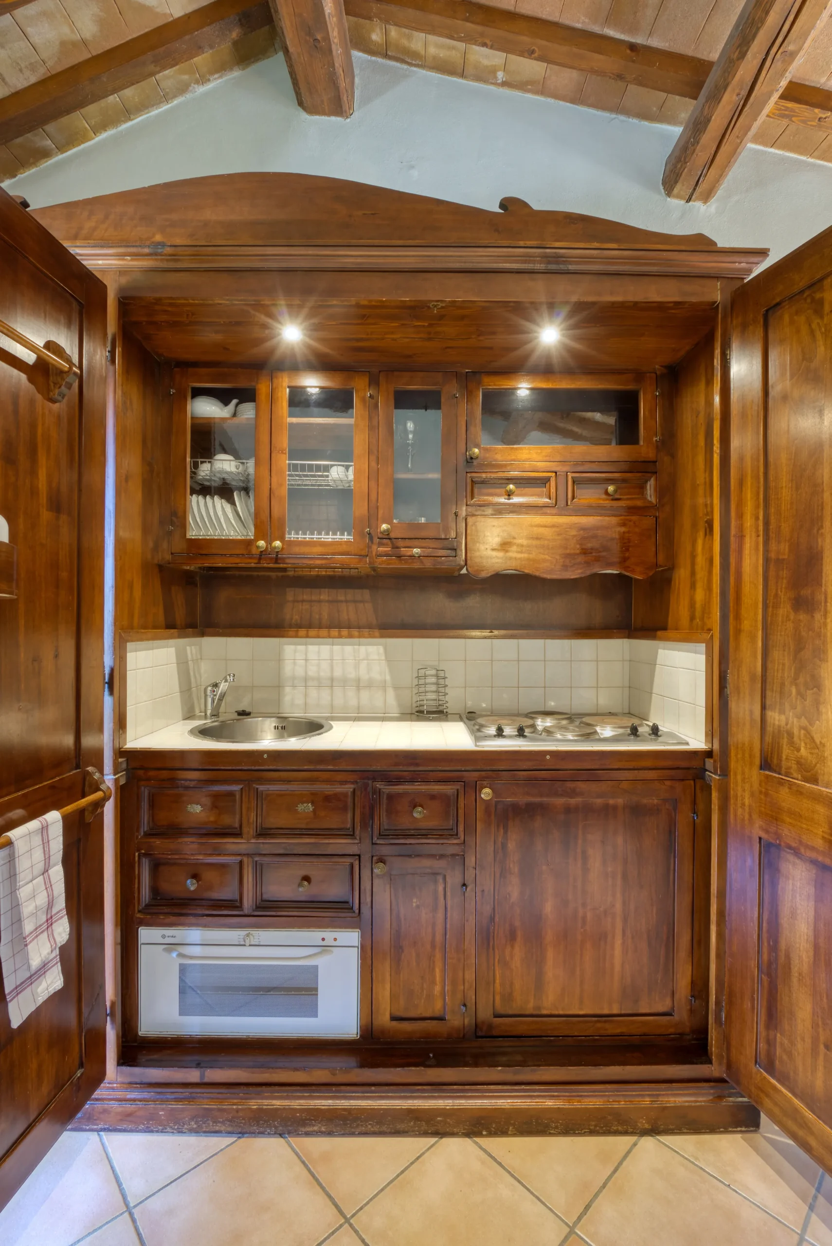 Upstairs, the living area opens onto a fully equipped kitchenette — with four burners, oven, refrigerator, sink, and ample workspace — alongside a snug sitting corner that can easily transform into a sofa bed for extra guests.